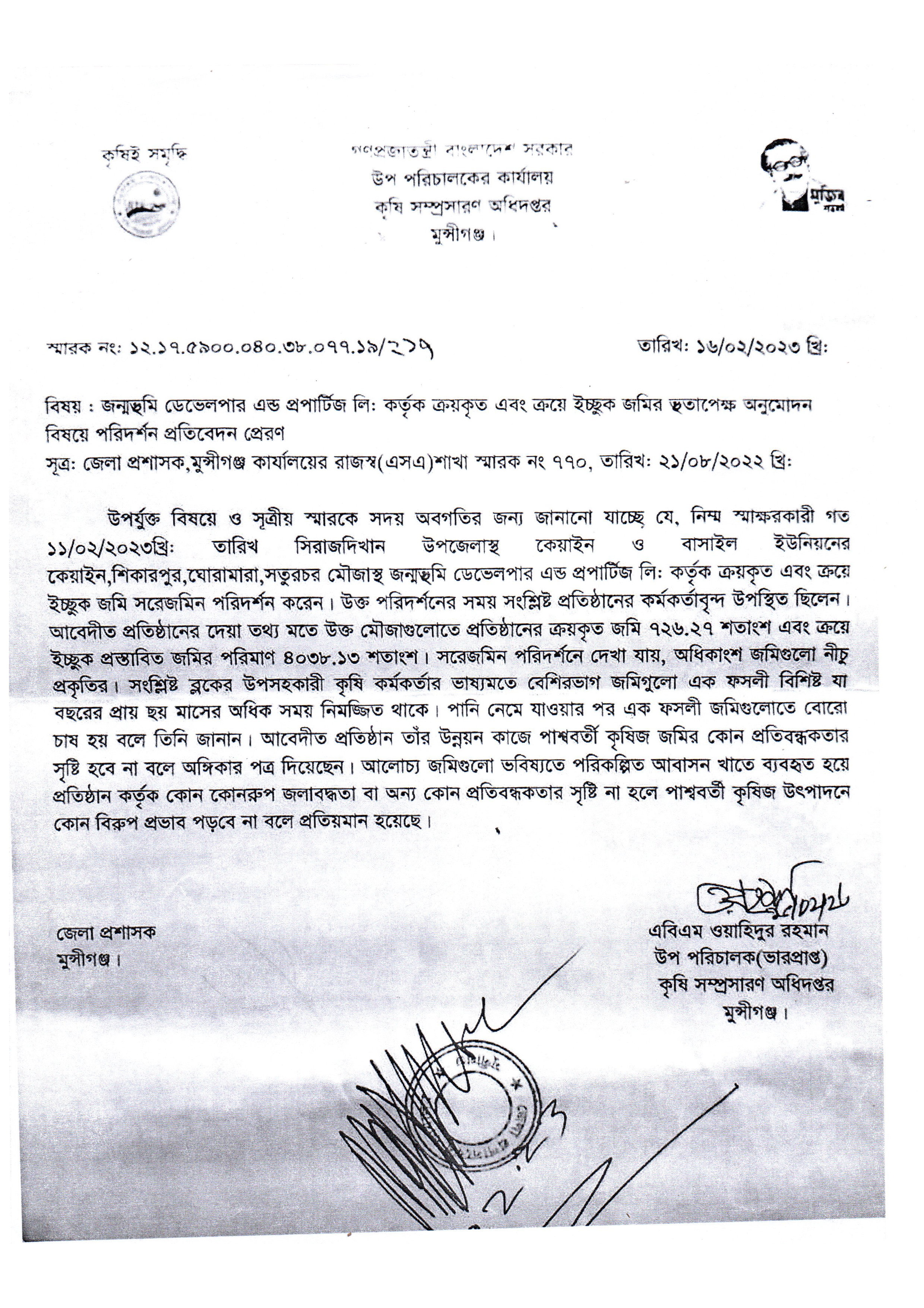 The Department of Agricultural Extension conducted an official field inspection regarding land acquired by Janmobhumi Developer & Properties Ltd. The inspection assessed the agricultural characteristics of the land and evaluated potential impacts on farming activities.