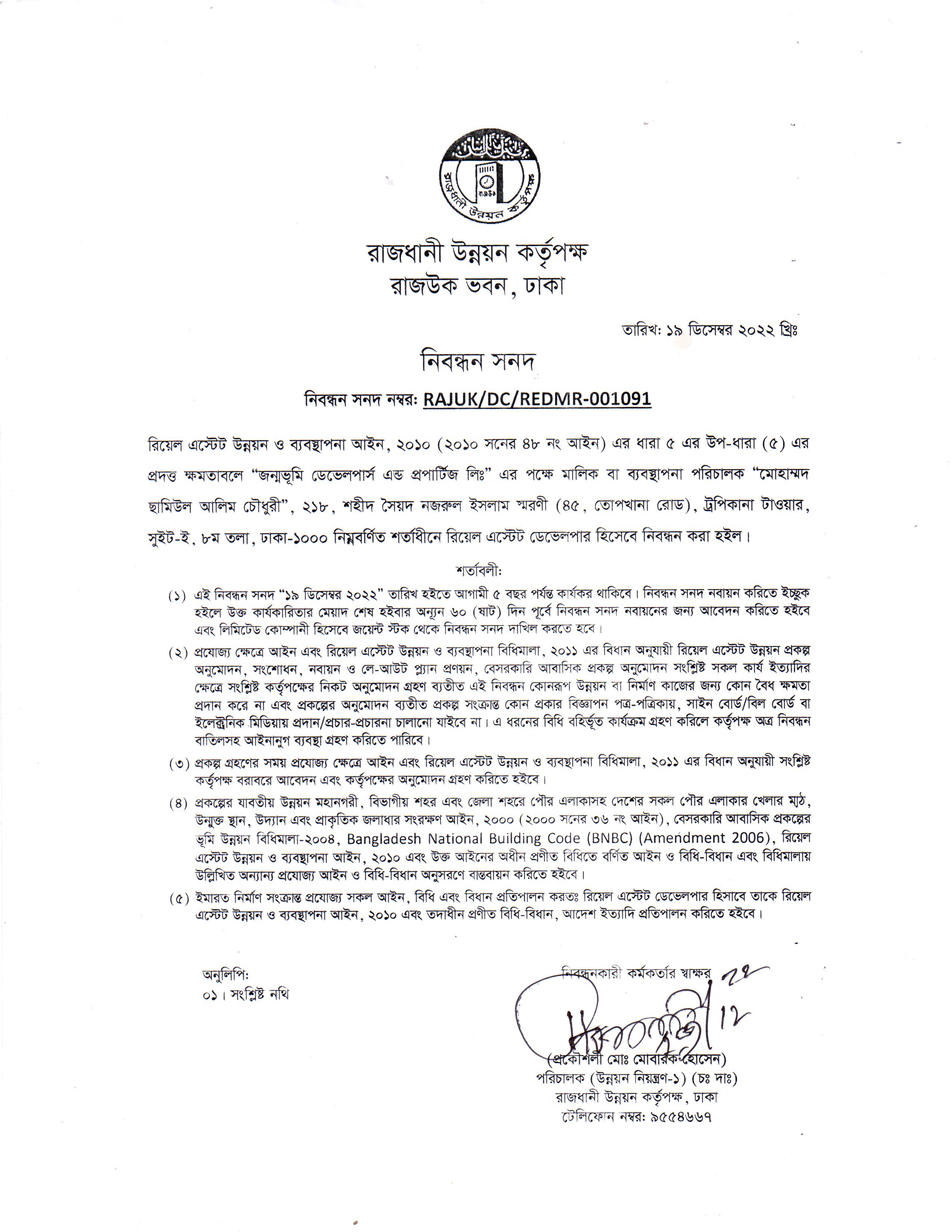 The certificate confirms that the company meets the regulatory requirements to conduct real estate development activities within RAJUK’s jurisdiction, subject to compliance with relevant building codes, planning standards, and applicable laws