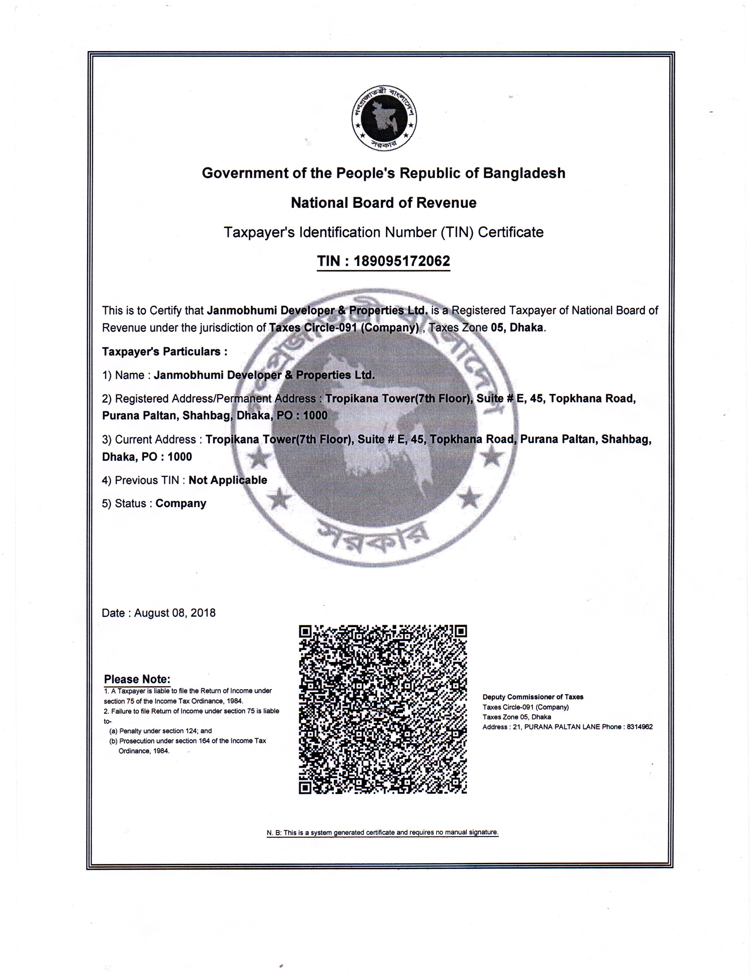 Janmobhumi Developer & Properties Ltd. is a registered taxpayer with the National Board of Revenue under the jurisdiction of Taxes Circle-091 (Company), Taxes Zone 05, Dhaka. This Taxpayer Identification Number (TIN) certifies that the company is duly registered for tax purposes and operates in compliance with the tax regulations of Bangladesh.
