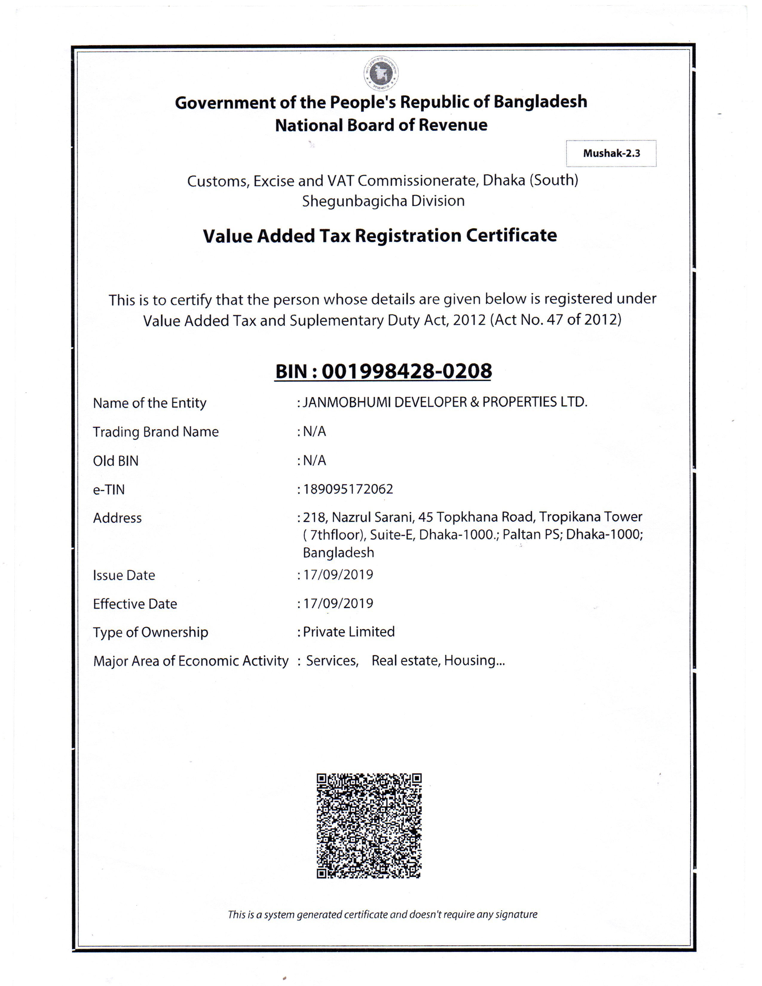 Janmobhumi Developer & Properties Ltd. is officially registered under the Value Added Tax and Supplementary Duty Act, 2012 (Act No. 47 of 2012). This registration authorizes the company to conduct taxable business activities and comply with VAT regulations of Bangladesh.
