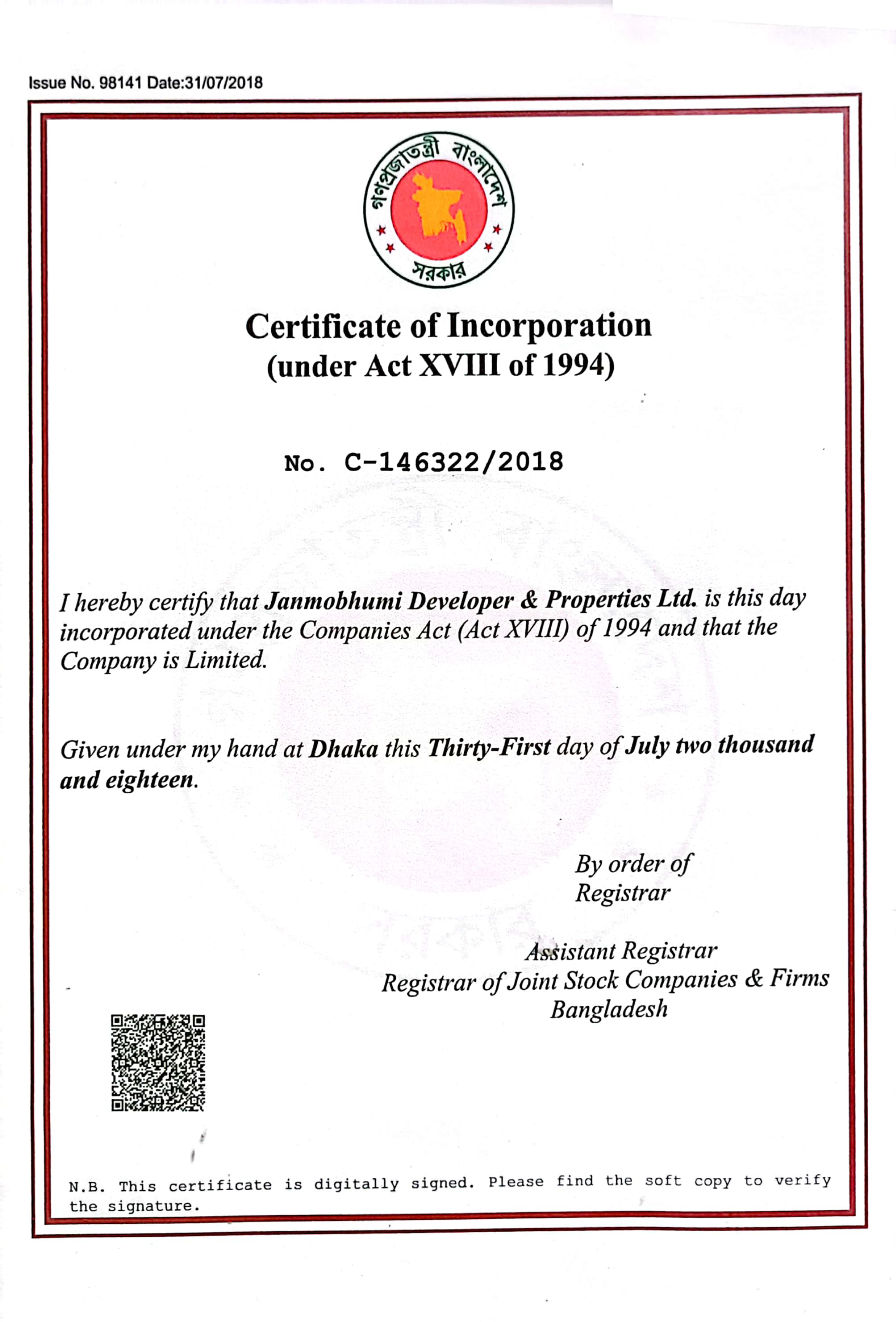Janmobhumi Developer & Properties Ltd. is a legally registered private limited company, duly incorporated under the Companies Act (Act XVIII) of 1994 of Government of the People's Republic of Bangladesh. The company was formally established in Dhaka on 31 July 2018 and operates in full compliance with the applicable corporate laws and regulatory requirements of Bangladesh.