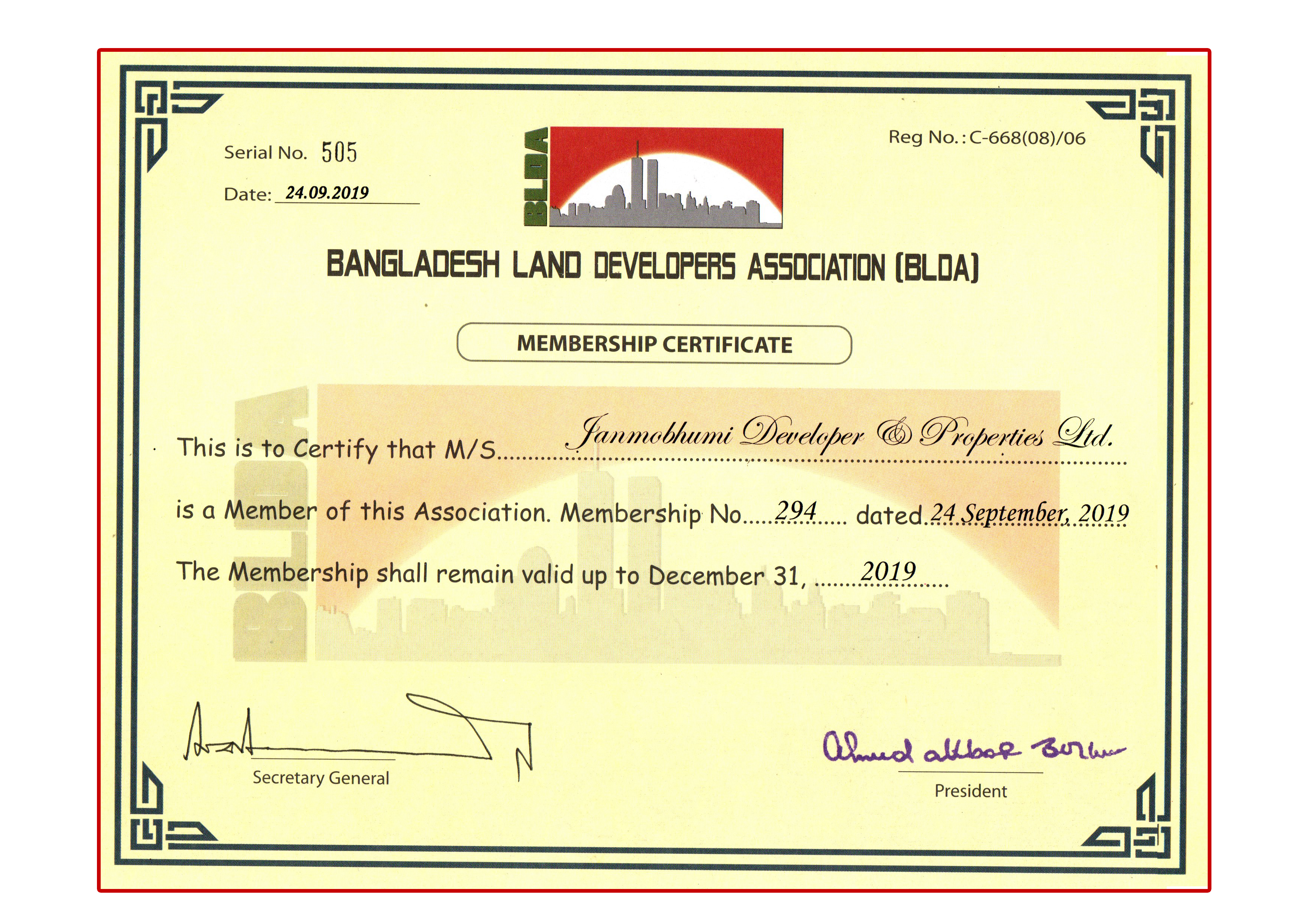 It brings me immense pride and joy to share a significant milestone in our journey at Janmobhumi Developer And Properties Ltd. We are officially a certified member of the Bangladesh Land Developers Association (BLDA).