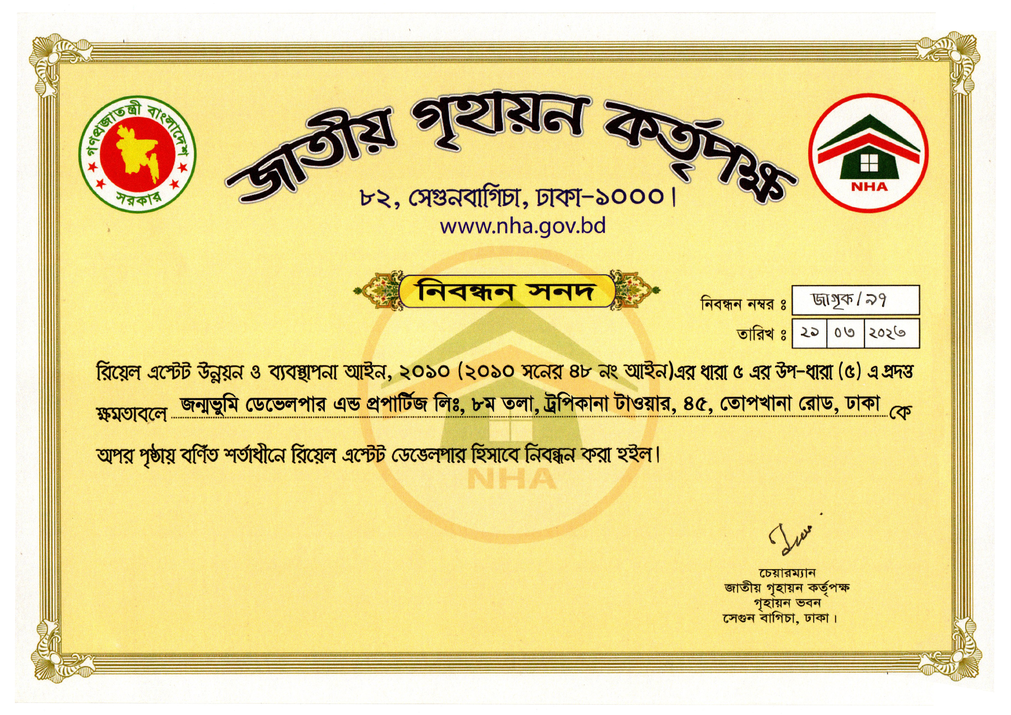 At Janmobhumi Developer And Properties Ltd., we believe that the foundation of every home is built on trust and legal integrity. It is my great pleasure to announce that our company is officially registered with the National Housing Authority (NHA) of the Government of the People's Republic of Bangladesh.